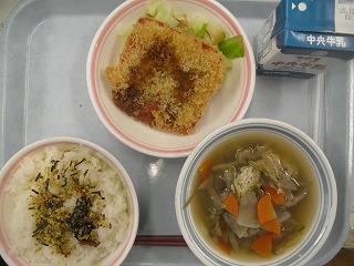 ご飯 牛乳 手作りハムカツ ゆでキャベツ 根菜汁 たまごふりかけ