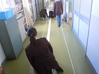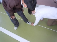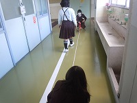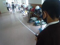 5年生が巻き尺を使って歩幅を測っていました。10歩の長さを測ることで1歩の平均を求めるためです。