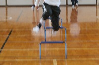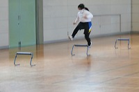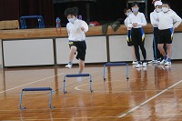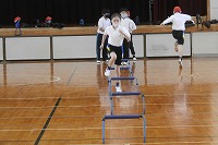 4年生が体育でミニハードルに取り組んでいました。低いハードルを使って、高いハードルをスムーズに跳ぶための練習をします。