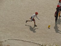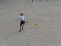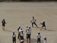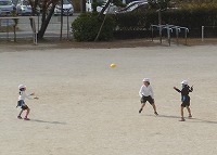 4年生が体育で、タグラグビーの2対1練習をしていました。2人がボールをパスしながら攻撃し、1人がそのパスを防いで守ります。