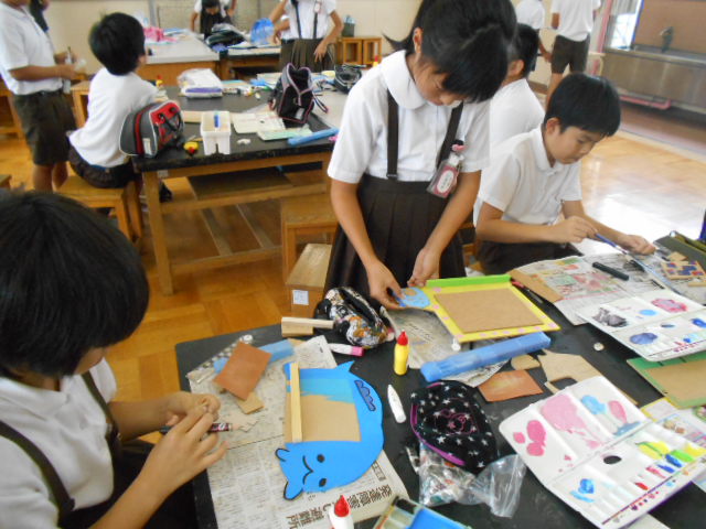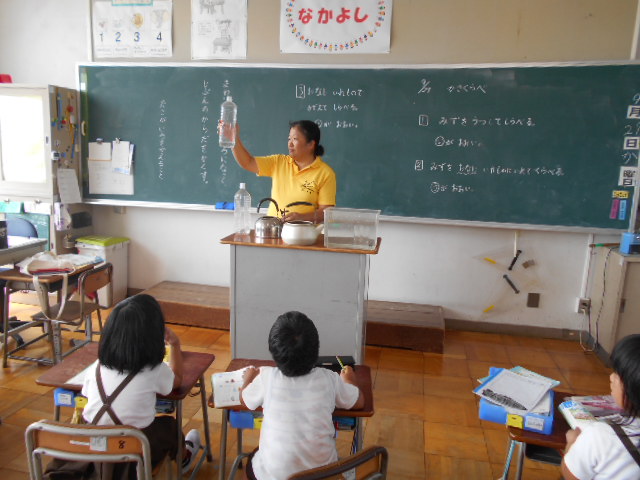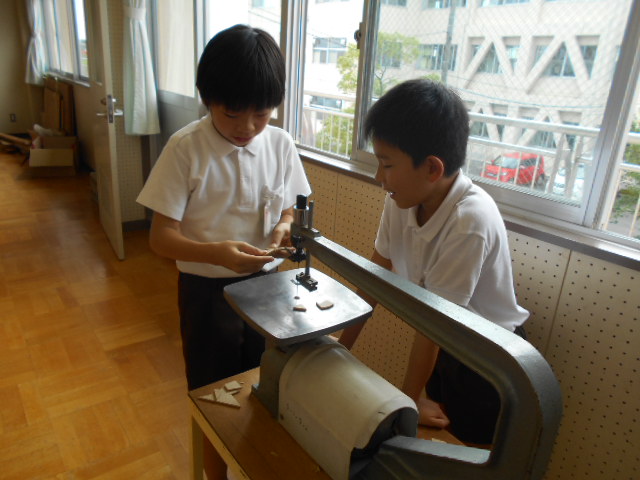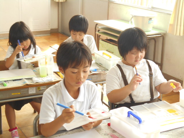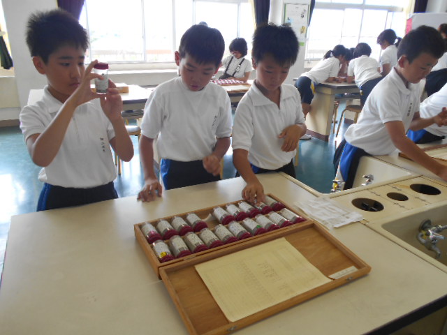 運動会が終わり、みんな落ち着いて勉強しています。1年1組では、算数の勉強で、かさくらべをしました。やかんとペットボトルでは、どちらのかさが多いか実物を使って比べます。1年2組では、絵の具を使って、水の量によってどのように線が変わるか確かめました。4年生は、消防署見学に行きました。5年生は、糸のこを使って、掲示板作りです。6年生は、西川端小学校の下はどうなっているかボーリング試料を使って調べました。みんながんばっています。