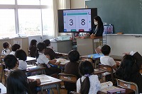 1年生が算数で、数字の大きさくらべをしていました。大きなモニターに順番に映し出される2つの数字を見比べて、どちらが大きいか判断して答えます。実際の数と、文字としての数字が結びついているかが分かります。