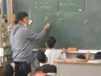 2年生が国語で漢字の練習をしていました。何人かが一斉に黒板に漢字を書いていく中で、書き順や字のバランスなど気をつけるポイントが見えてきます。
