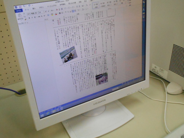 ICT支援員さんがみえました。1.5.6年生がコンピュータの勉強をしました。1年生は、1年の思い出のベスト1を選び、カードづくりをしました。5年生は、5年生の思い出を文集にします。何人かは印刷もしました。6年生は、写真も選択し、卒業文集が完成に近づいてきました。