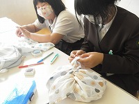 文化クラブは、手作りの袋に、糸で名前を縫い付けていました。通常、裁縫は5年生の家庭科で学びますが、クラブに入っている4年生は先取りして学習していました。