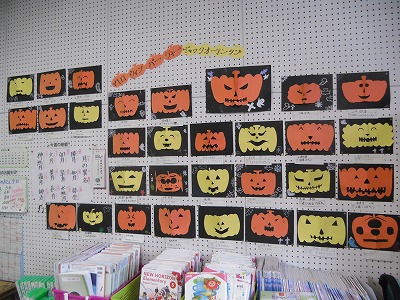 ハロウィーンの「ジャック・オー・ランタン」が飾ってあります。黒い紙の上に鼻をとがらせるように立体的に貼ってあるので、見る角度によって表情が変わって見える顔もあります。歯のギザギザなど細かく切ったり、目をとがらせてみたりと、いろいろな雰囲気のかぼちゃが出来上がりました。