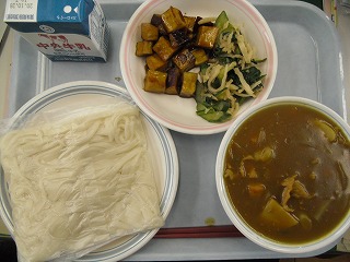 カレーうどん 牛乳 切干大根のゴマ浸し さつまいもと大豆の黒蜜がらめ