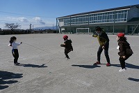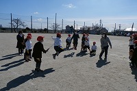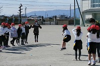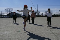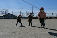 まわりで見ている子の中にも、縄を跳ぶ子と一緒になってその場でジャンプする子もいます。しっかり縄の動きを見ている証拠で、順番を待っている間も練習です。