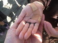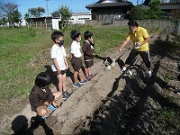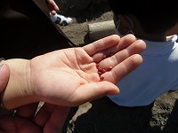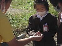 2年生が、野菜の種まきをしていました。大根とカブの種はとても小さいので、こぼさないようにみんな恐る恐るでした。 手のひらの指のすき間にある小さい種が見えますか?