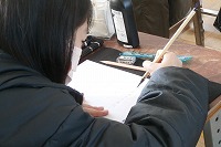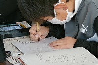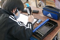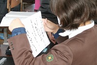 5年生が国語で、学校をテーマに詩を書いています。書いたものを筆で清書し、冬休みの課題で作った消しゴムハンコを落款として押して完成です。