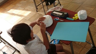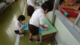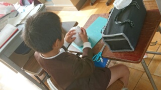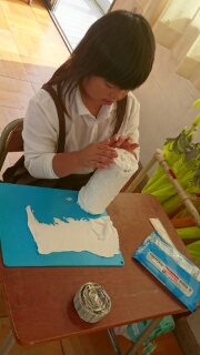 作品展へ向けて、2年生が新聞紙と紙粘土でケーキ作りをしています。