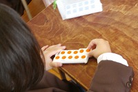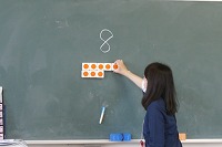 算数で数の学習をしていた1年生が、数図ブロックで表し始めました。実物と数字に続いて、実物の代わりに使う具体物です。同時に、5つのまとまりを意識させるために、8この数図ブロックを4個ずつ並べるだけではなく、5個と3個の組み合わせで8を表すことを確認していました。