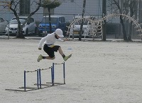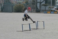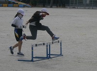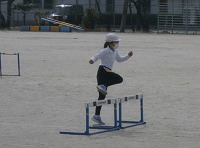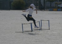 3年生が体育でハードルに挑戦していました。最初は低いハードルでできるだけ低く早く走り抜ける練習です。ハードルとハードルの間を一定の歩数にしないと右足で跳んだり左足で跳んだり混乱してしまいます。