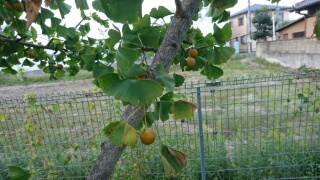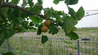 西川端小のビオトープに、小さいですが銀杏の木があり、すでに銀杏を実らせています。