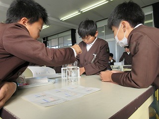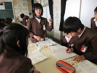 6年生が理科で、酢・漂白剤などの身近な液体がアルカリ性か酸性かを、リトマス試験紙やBTB溶液を使ってなかま分けをしました。試験管の液が違う色に変化する様子を、興味深げに観察したり記録したりしいました。
