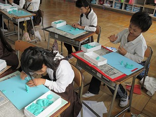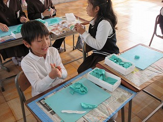 2年生が、学習発表会の思い出を粘土で表現しました。人の体の中(腸や胃)を作ったり、たくさん子どもを作って並べたりしていました。