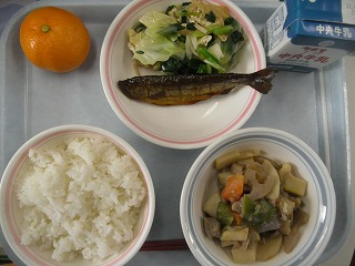 ご飯 牛乳 のっぺ ニジマスの甘露煮 小松菜となめたけの和え物 みかん