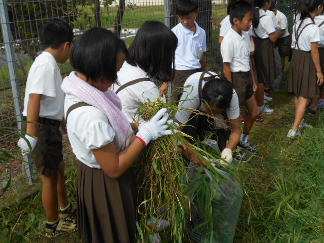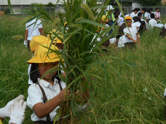 今日は、全校出校日です。久々に学校で子どもたちの元気な姿を見ることができました。サツマイモを育てている西川端ファームは、草だらけです。全校児童が草取りをしました。
