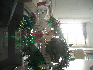 理科室に住む骸骨のキャサリンもクリスマスを迎えるのにサンタクロースのようにコスプレをしています。モールのクリスマスリースを組み合わせた、ちょっと派手なサンタです。