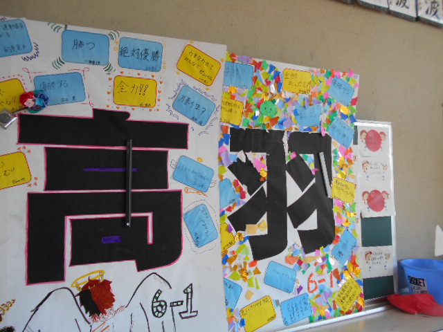 今年の運動会と学習発表会のテーマは、「羽ばたけ 未来へ 高くとべ」です。各クラスが、一文字ずつ担当し、文字のまわりの余白部分の飾りつけをします。6-1の担当は、「羽」と「高」です。