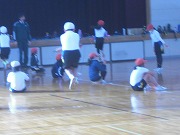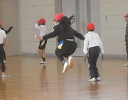 4年生が体育で縄跳びをしていました。前跳びから順に様々な跳び方に挑戦し、〇回以上、とか〇分以上とか目標に、自分の記録に挑戦していました。
