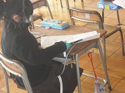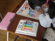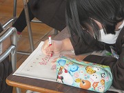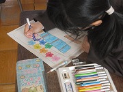 1年生が、新入生に向けての学校紹介の紙を作っていました。学校内の各部屋がどんなところかを絵と文で表して、入り口に貼るのです。自分たちも今の2年生のみんなに作ってもらった紹介の絵を見ているので、どんなものかはよく分かっています。楽しそうにカラフルな絵を描いていました。