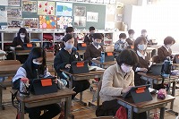 4年生が国語でみんなの意見を出し合った後、タブレットで黒板の写真を撮っていました。意見がたくさんありすぎて板書をノートに書く時間がなく、この意見を次回に生かすためです。