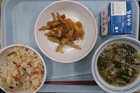桜海老と切り干し大根のうま味ご飯 牛乳 公魚(わかさぎ)の越津葱(ねぎ)ソースかけ