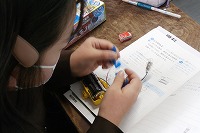 3年生が理科で電気の実験をしていました。様々なものが電気を流すか流さないかを調べます。はさみや1円玉、クリップ、アルミ箔などが電気を流すかどうか、あらかじめ予想して、実際に一人一人実験しました。