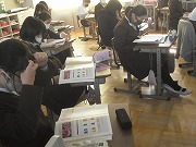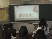 6年生が酸性とアルカリ性について学習のまとめをしていました。5つの無色透明の液体にある液体を入れると、それぞれ全く違う色に変わる様子をビデオで見ながら、酸やアルカリの特徴について復習をしていました。