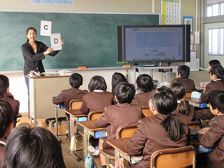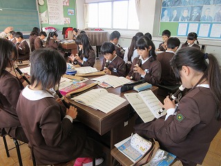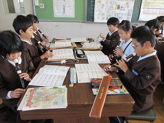 3年生がリコーダーの練習をしていました。譜線上にたくさん並んだ音符とにらっめっこをして吹いていました。5年生はマイラ先生の後に続いてsing~♩~