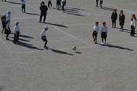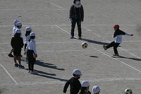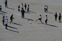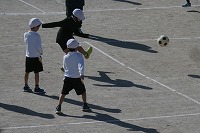 1年生が体育で、ドッジボールのコートを使って、シュートゲームをしていました。内野の人はゴールキーパーの役割です。コートの後ろのラインをボールが通り過ぎると得点です。ボールを後ろに抜かれないようにみんなで協力します。