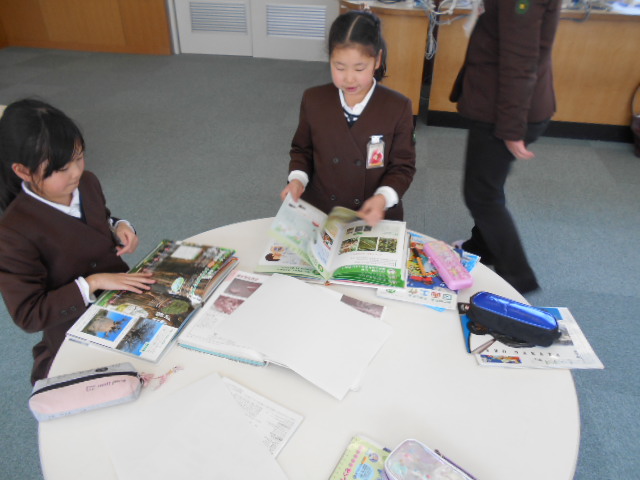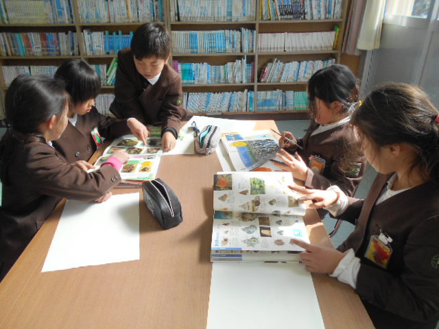 図工では、版画を始めます。テーマは「動く動物」。まず、図書室で資料を探し、参考にしながら、下絵を描きます。