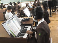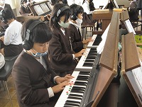 3年生が音楽で和音について学習していました。一つの曲の主旋律を聞きながら、一人一人がヘッドホンをつけて和音になる旋律を弾きます。うまく音の響きを感じることができるでしょうか。