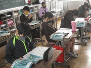 4年生が音楽鑑賞で、曲の表現を聞き取り、ワークにまとめていました。楽譜で、強弱を表すp(ピアノ)などの記号と、実際の曲の様子を比べていました。