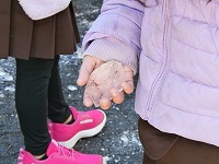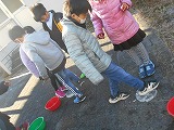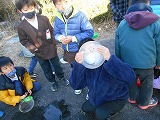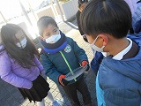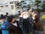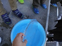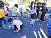 2年生が、生活科で「冬」の学習をしていました。気温が氷点下まで下がることを見越して、事前に先生がたくさんのバケツやたらいに水をはっておいたので、透明のきれいな氷ができていました。暑さが3~4cmにもなっていて、みんな冷たいといいながら触ったり割ったりと楽しんでいました。