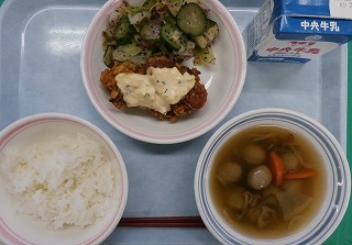 ご飯 牛乳 チキン南蛮 ゆかり和え イワシのつみれ汁