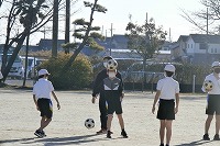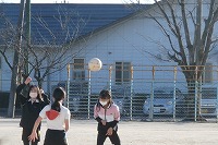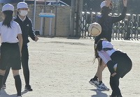 6年生が体育のサッカーで、ヘディングの練習をしていました。ただ、まだ慣れていないので、つい頭のてっぺんにボールが当たってしまいます。ボールを投げる側がやさしく投げると、ボールがふわりと上から落ちてくるので、頭の上に当たりやすくなってしまうのです。そして、ボールはまた上の方に跳ね返ってしまいます。ボールを力強くコントロールするために、額の上の部分に当てようと、何度も練習していました。