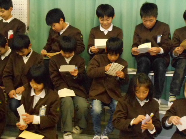 4年生は、二分の一成人式を行いました。合奏や歌を披露し、夢や感謝の気持ちを伝えました。おうちの人と手紙の交換もしました。