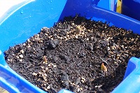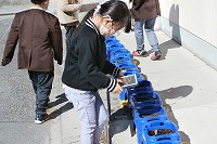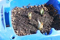 1年生が生活科でチューリップの観察をしていました。定期的に水やりを続けており、大きさはさまざまですが、ほとんどの植木鉢にチューリップの芽が出ています。