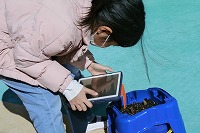 タブレットを使って自分の植木鉢とチューリップの芽の写真を撮り、記録を積み重ねています。