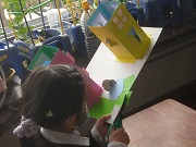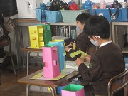 2年生が図工で取り組んでいる「まどをひらいて」のビルづくりが完成に近づいています。四角い普通の窓ばかりでなく、三角形や丸型、星形などいろいろな窓を作っています。また、2つのビルを作ってつなぐ「ツインタワー」に挑戦している子もいます。