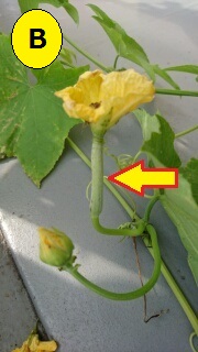 キュウリの花の時にも紹介したと思いますが、この花の付け根の太い部分が成長し、実になっていきます。つまり、Bの花が実をつける花ですので雌花ということになり、反対にAの花が花粉を飛ばす雄花ということになります。