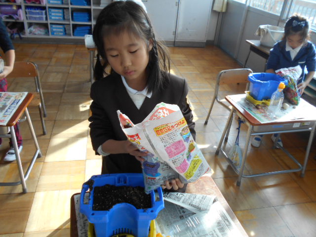 1年生は、チューリップやクロッカスの球根を植えました。ベランダで育てます。春が楽しみです。