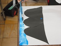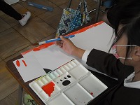 2年生が図工で、遠くの景色に広がる空を水彩で描いていました。1色の絵の具をただ塗るのではなく、水彩らしく絵の具に混ぜる水を増やしながら色が変化している様子を描いていました。