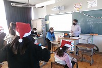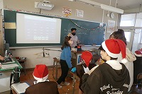 6年生が英語に関するクイズ大会を行っていました。クリスマスなので、解答者がサンタの帽子をかぶって楽しい雰囲気です。