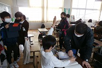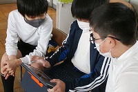 5年生が、タブレットに入っているアプリを使って動画を作っていました。必要な写真や映像を撮影し、テロップ用の文字などを作成して、アプリで編集します。グループでどんな動画にするか話し合いながら、撮影したり編集したりと試行錯誤です。