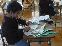 もうすぐ作品展・授業参観です。子どもたちの作品も完成に近づき、展示するための準備も進んでいます。1年生は水の生き物なので、水の中の飾り付けを作っています。海草や貝類など自分が作った水の生き物の近くに飾るためのものを作っていました。