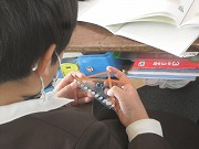 3年生が算数で、三角定規を使っていろいろな角の大きさを比べていました。三角定規の一つ一つの角だけでなく、2つの三角定規を組み合わせて大きな角にしたり、2つの角の大きさの違いを比べたりと、自分の三角定規で工夫していました。