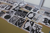 4年生が図工で掘っていた版画を刷っていました。黒いインクをローラーで版木につけて紙を置き、バレンで丁寧にこすります。色の濃い薄いがなくなるように、丁寧にこすって、紙をはがすときがドキドキです。